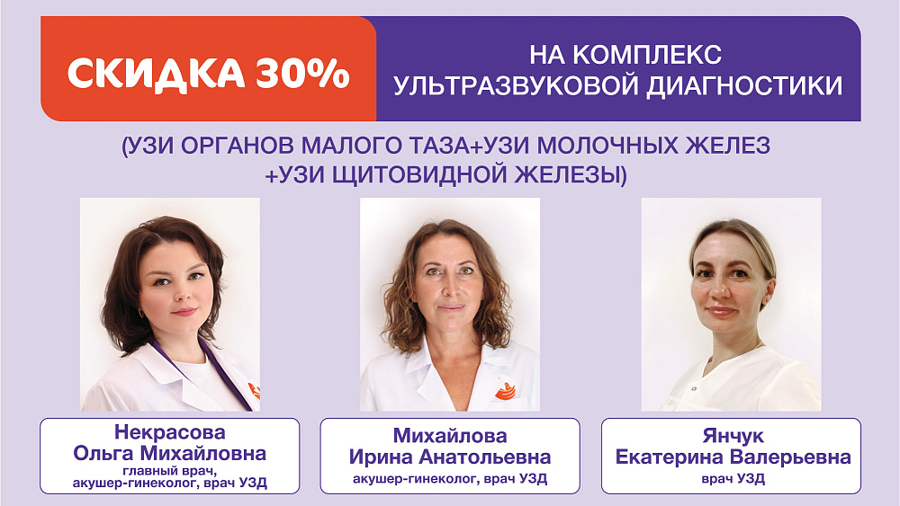 Комплекс «Женское здоровье» включает: УЗИ органов малого таза+УЗИ молочных желез+УЗИ щитовидной железы 10500 руб. вместо 15000 руб.