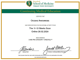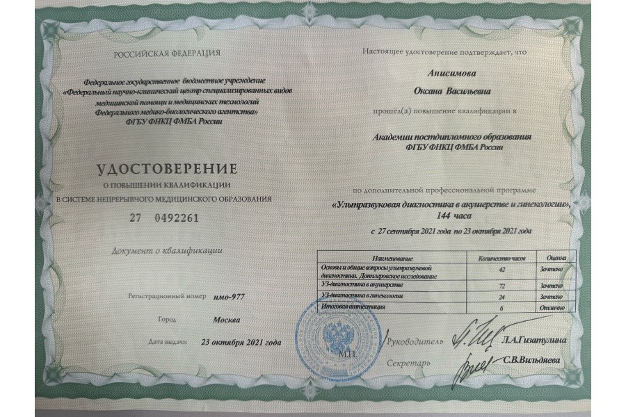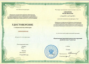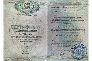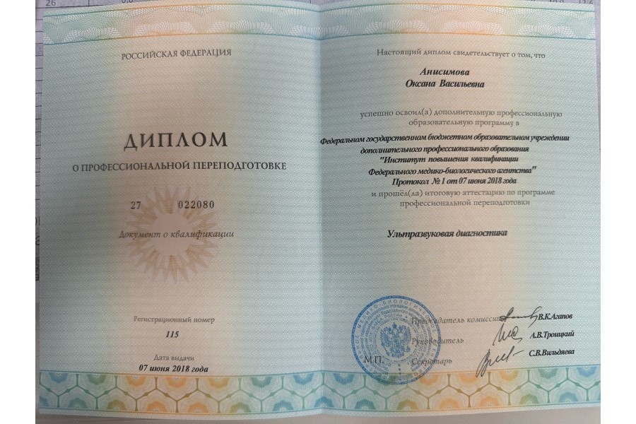 • Профессиональная переподготовка по специальности «Ультразвуковая диагностика», 2018 г.