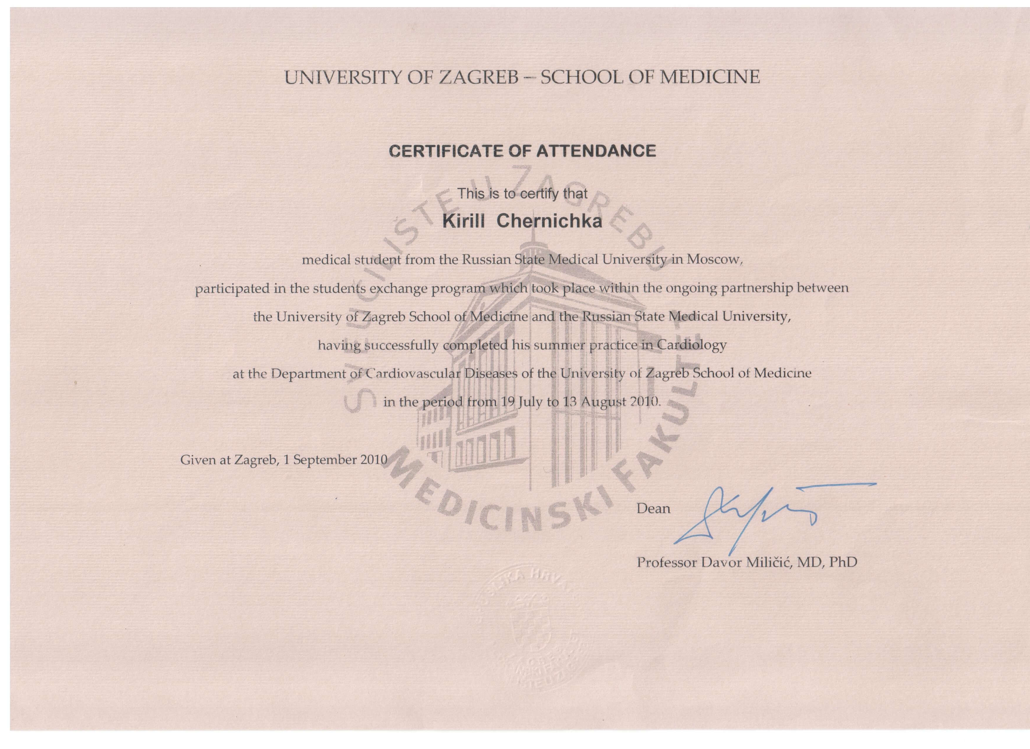 • 2010г-клиническая стажировка по кардиологии в Университетском Клиническом центре "Ребро", г.Загреб (Хорватия)