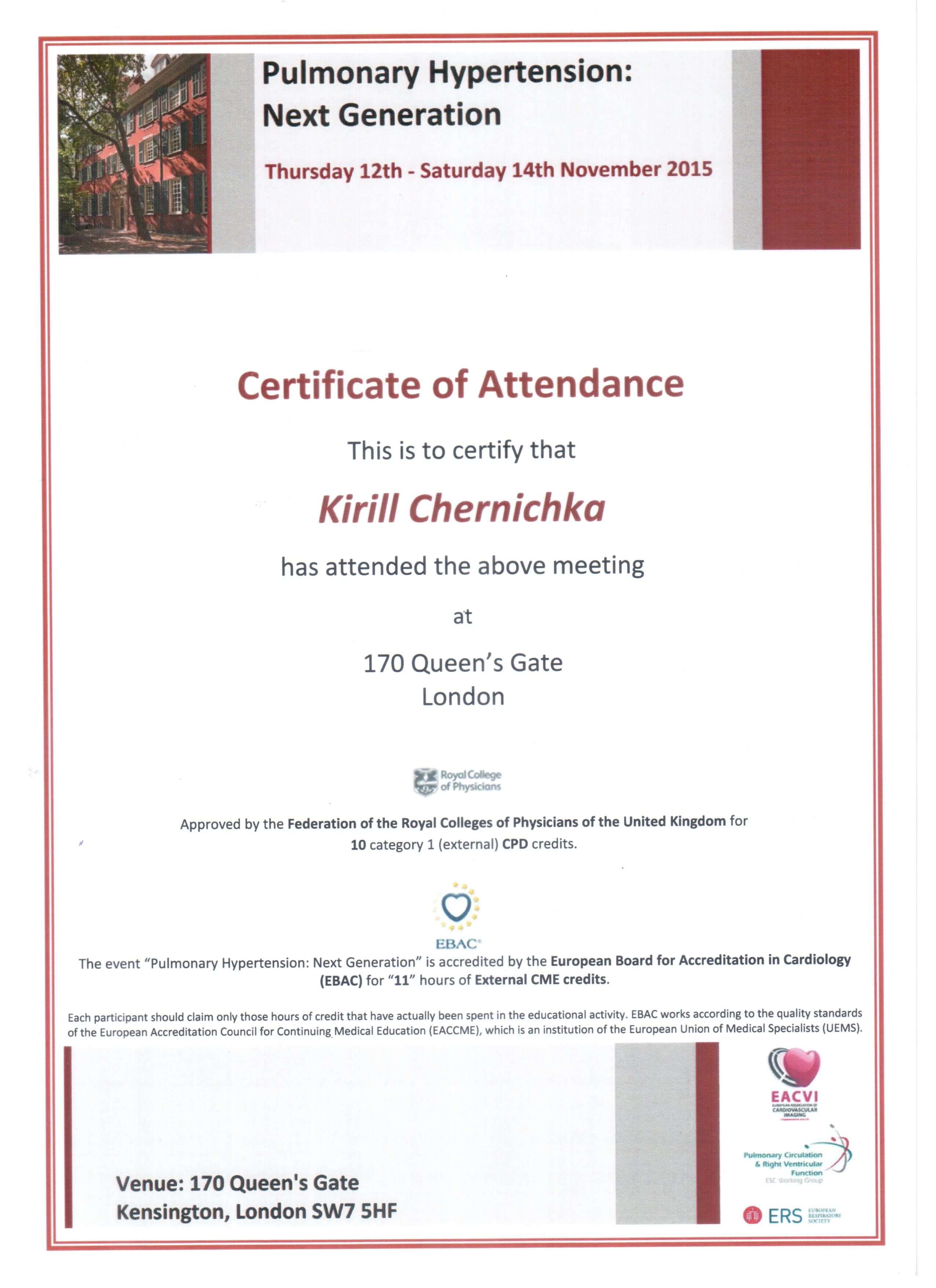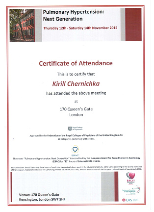 • 2015г- Школа «Легочная гипертензия: новое поколение», г. Лондон, Великобритания.