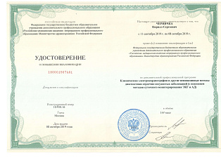 • 2019г- обучение на рабочем месте. Российская медицинская академия последипломного образования, "Основы клинической электрокардиографии с освоением методов ХМЭКГ и СМАД".