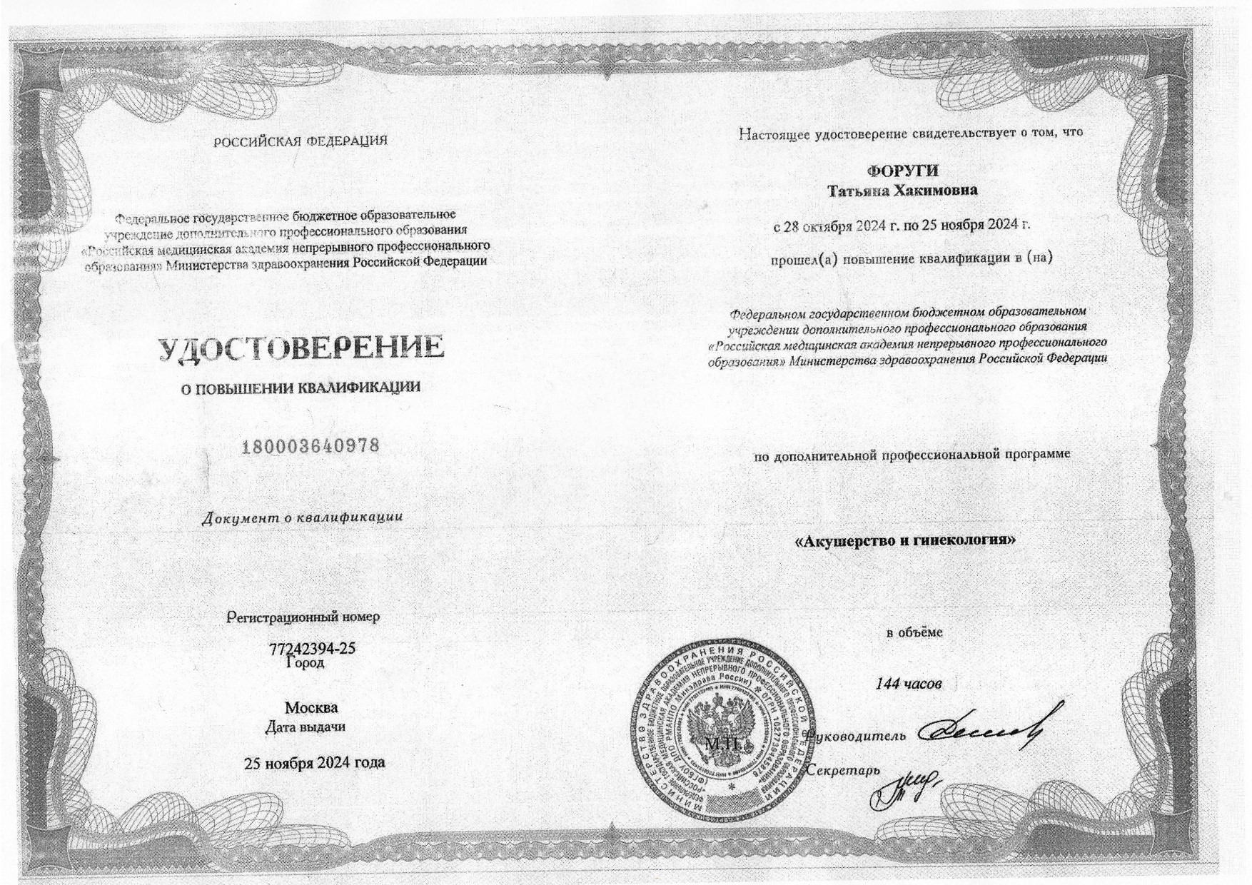 • 2024 г. - повышение квалификации по программе "Акушерство и гинекология"