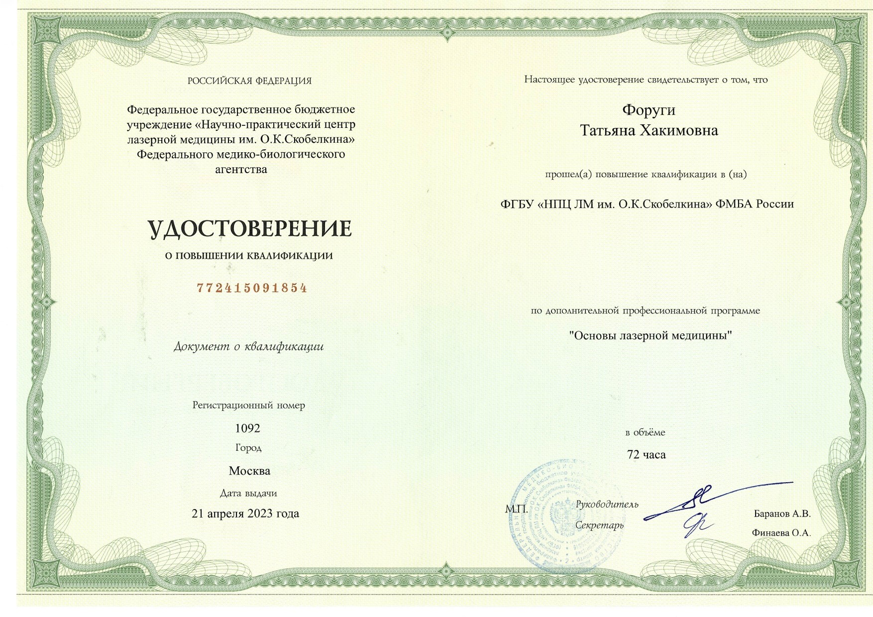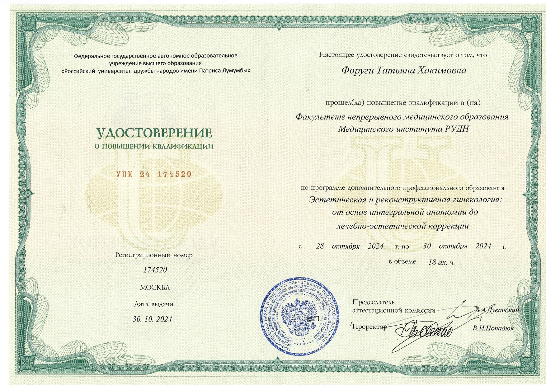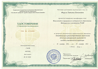 • 2024 г. - повышение квалификации по программе "Эстетическая и реконструктивная гинекология от основ интегральной анатомии до лечебно-эстетической коррекции"