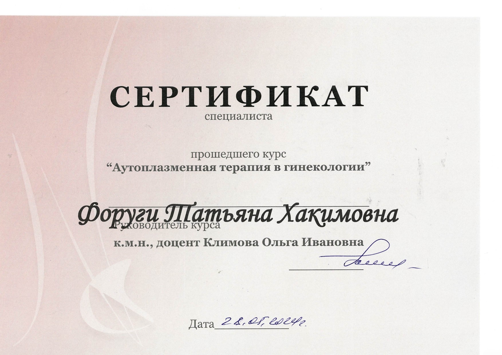 • 2024 г. - повышение квалификации на курсе "Аутоплазменная терапия в гинекологии"