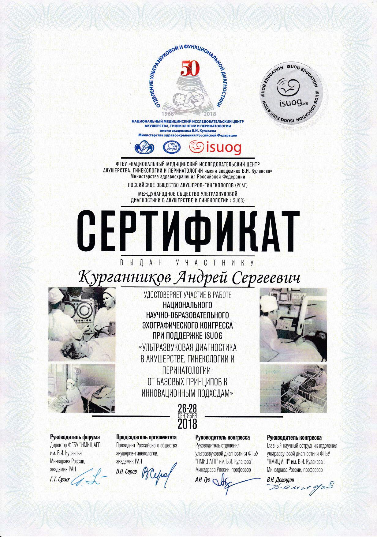 2018 г. - Участие в работе Национального научно-образовательного эхографического когресса при поддержке ISUOG «Ультразвуковая диагностика в акушерстве, гинекологии, и перинатологии: от базовых принципов к инновационным подходам»