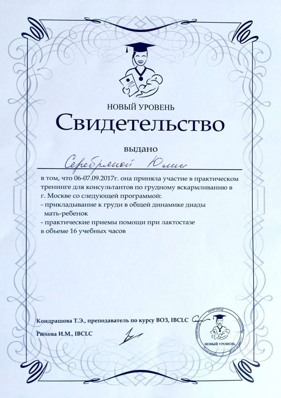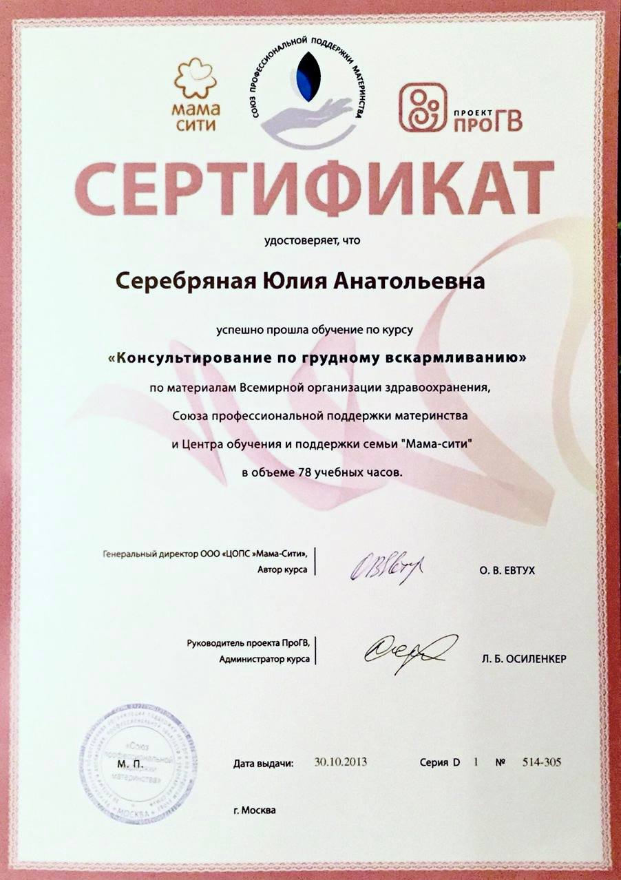 - 2013 г. – Курс «Консультирование по грудному вскармливанию», Центр обучения и поддержки семьи «Мама Сити», г. Москва