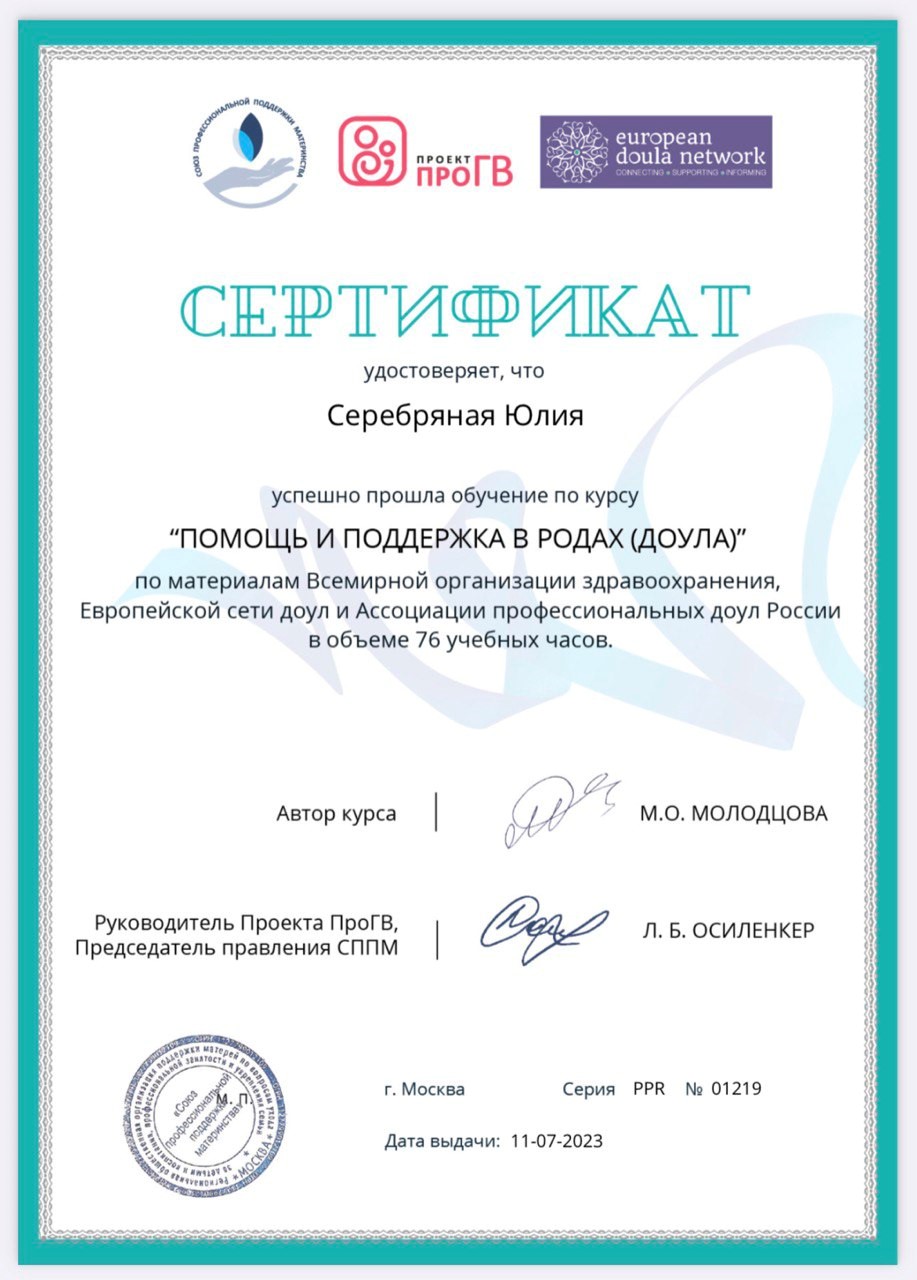 - 2023 г. – Курс «Взаимодействие с пациентом в ситуации перинатальной потери», Благотворительный фонд «Свет в руках», г. Москва