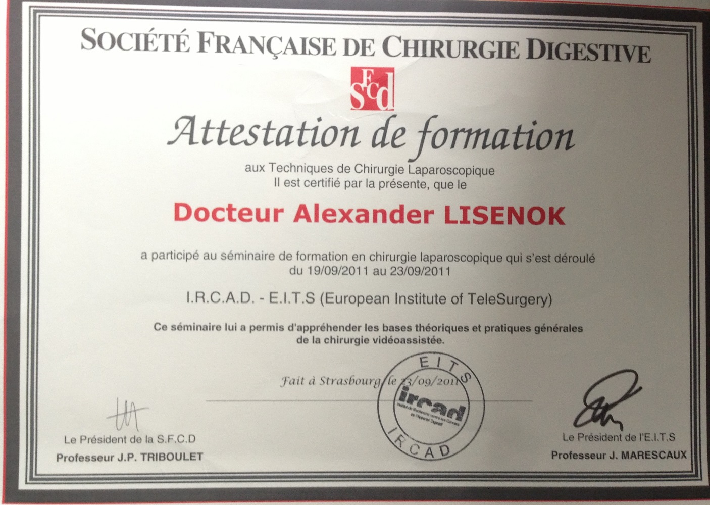 - Клиника Севиль (Иркад), индивидуальная стажировка по «Роботическим операциям и мини-лапароскопии», Страсбург, Франция.