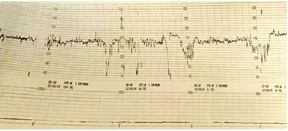 Пациентка была госпитализирована в родильное отделение КГ MD GROUP на Севастопольском для динамического наблюдения, по данным КТГ-мониторирования отмечены признаки компрессии пуповины плода (урежения сердцебиения плода до 70 уд/мин, которые восстанавливались).