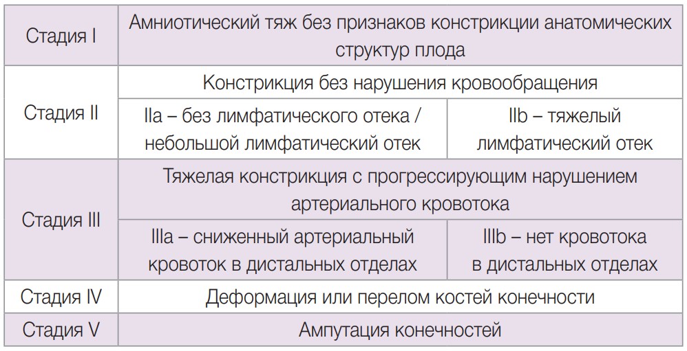 Синдром амниотических перетяжек является крайне опасным состоянием. Несмотря на то, что частота встречаемости низкая, его последствия влияют на жизнь плода и могут быть критическими. Необходимо принять во внимание, что у пациенток с САП часто наблюдаются поздние выкидыши и преждевременные роды [3]. Основным методом диагностики является УЗИ, которое основано на визуализации последствий влияния перетяжек на анатомические структуры плода, однако в большинстве случаев саму амниотическую перетяжку визуализировать с помощью ультразвука не удается [14]. Hsler et al. в 2009 году описали пренатальную классификацию, основанную на классификации Weinzweig 1995 года, но включающую дополнительную стадию между тяжелой констрикцией и ампутацией (таблица 1) [16]. Стадия I характеризуется наличием амниотических тяжей без каких-либо признаков констрикции; стадия II – констрикция без нарушений кровообращения; стадия III – тяжелая констрикция с прогрессирующим нарушением артериального кровотока; стадия IV – деформация или перелом кости в месте констрикции; стадия V – внутриутробная ампутация конечности. Стадия II также учитывает отсутствие или наличие небольшого лимфатического отека (IIa) или наличие тяжелого лимфатического отека (IIb), а стадия III разделяется на сниженный артериальный кровоток в дистальных отделах (IIIa) и отсутствие кровотока в дистальных отделах (IIIb) [17,18].