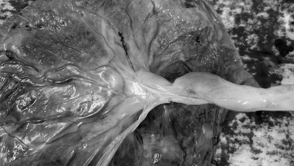 Проведено чревосечение по Джоэлу – Кохэну, кесарево сечение в нижнем маточном сегменте, родился живой недоношенный мальчик, массой 1490 г, ростом 57 см, оценка по шкале Апгар 5/7 б, по Сильверману 5/6 б. У плода отмечены: варусная установка обеих стоп, в нижней трети левой голени 2 поверхностные циркулярные перетяжки, субтотальная синдактилия 4-го и 5-го пальцев правой кисти. При осмотре плаценты визуализировалась странгуляционная перетяжка в области корня пуповины, образованная амниотическими тяжами, сужающая просвет хода сосудов пуповины.